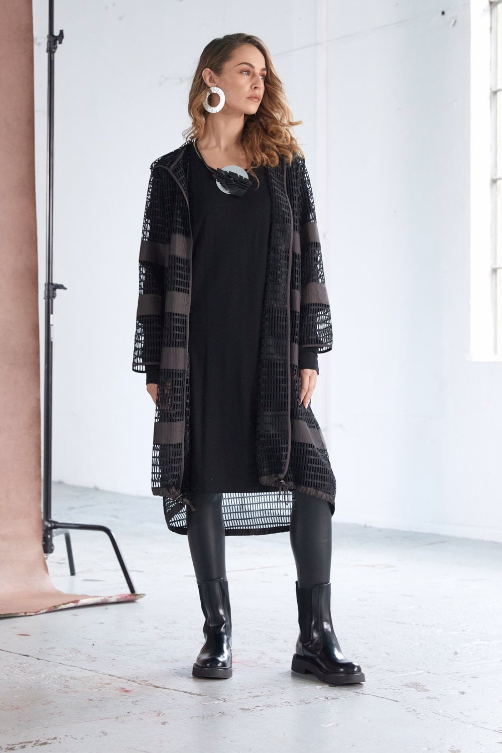 LIGHT TOUCH; The NAYA sheer weave long line jacket with bands of contrast trim is the perfect last layer to finish your look. Designed to compliment, the fit is loose yet delicate, avoiding the addition of extra fabric.
